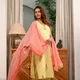 For Women: Pair this vibrant kurta set with statement jhumkas and transparent heels for an elegant festive look.