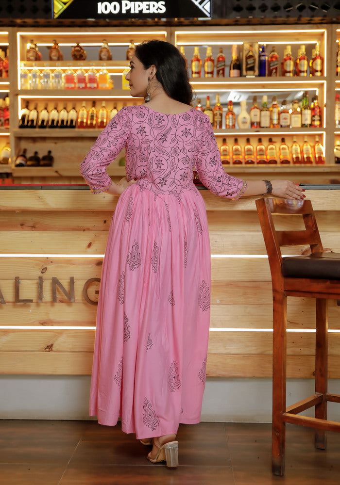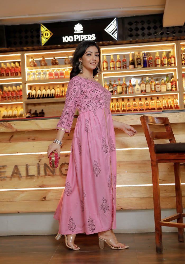 Women Pink Floral Block Print Side Slit Kurta 216-PNK