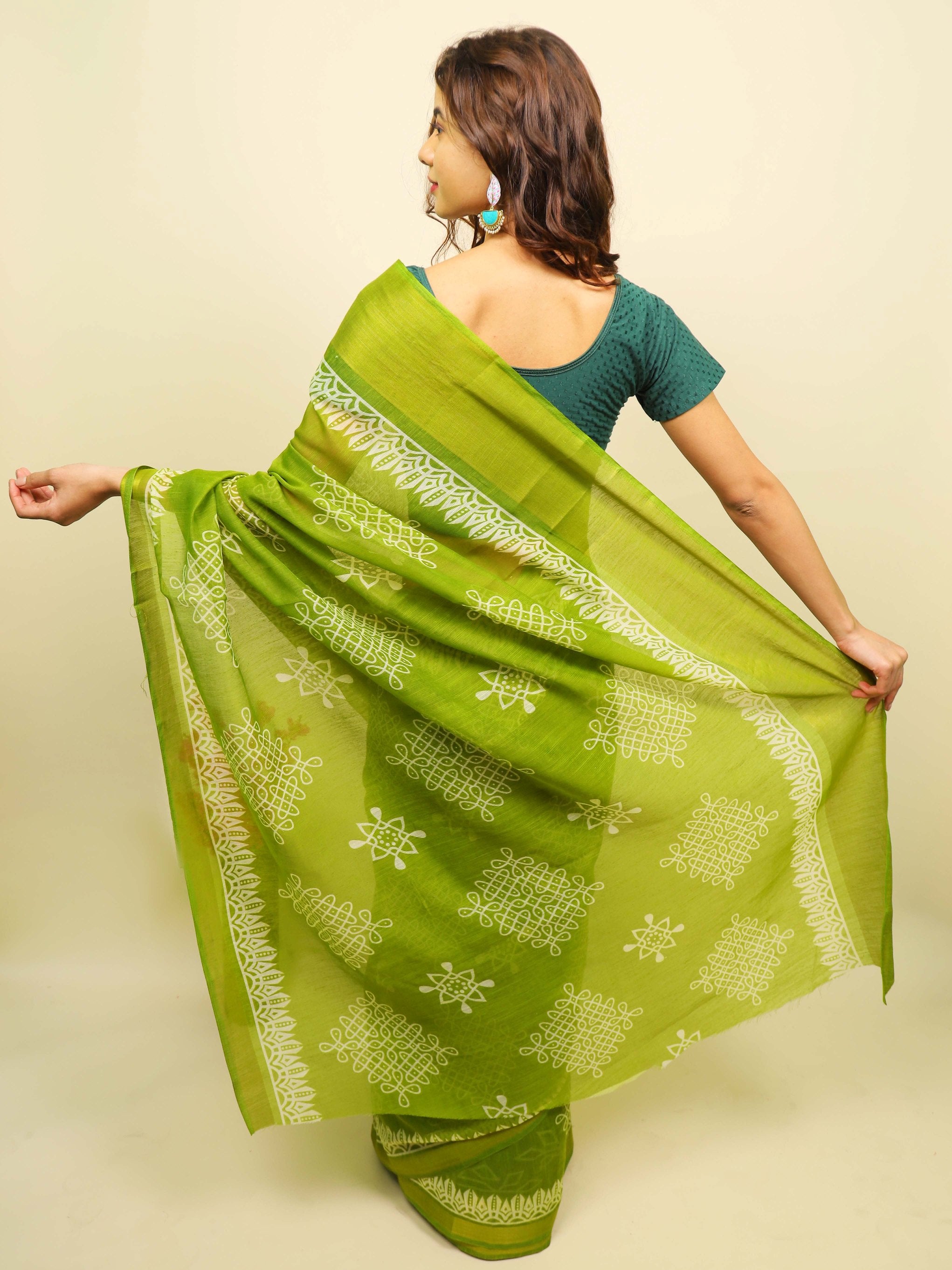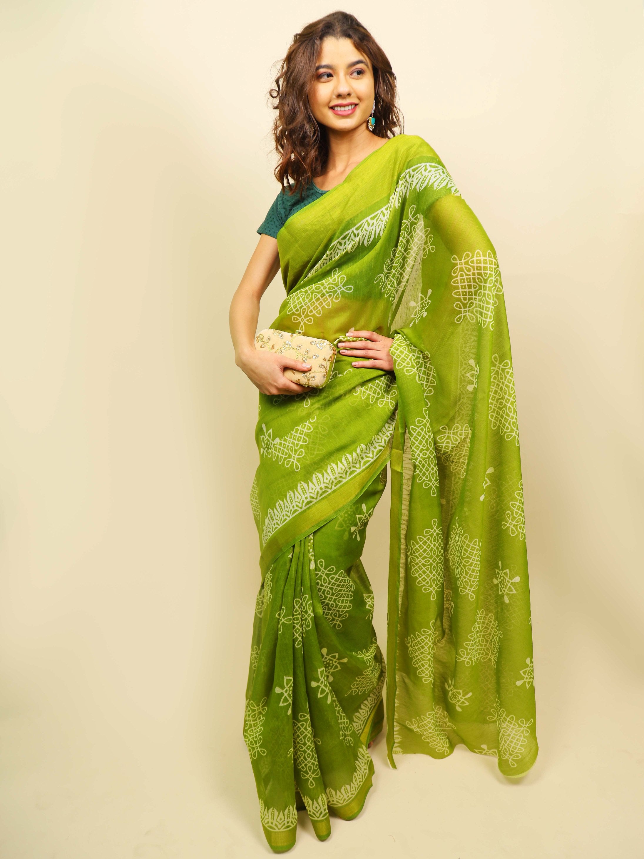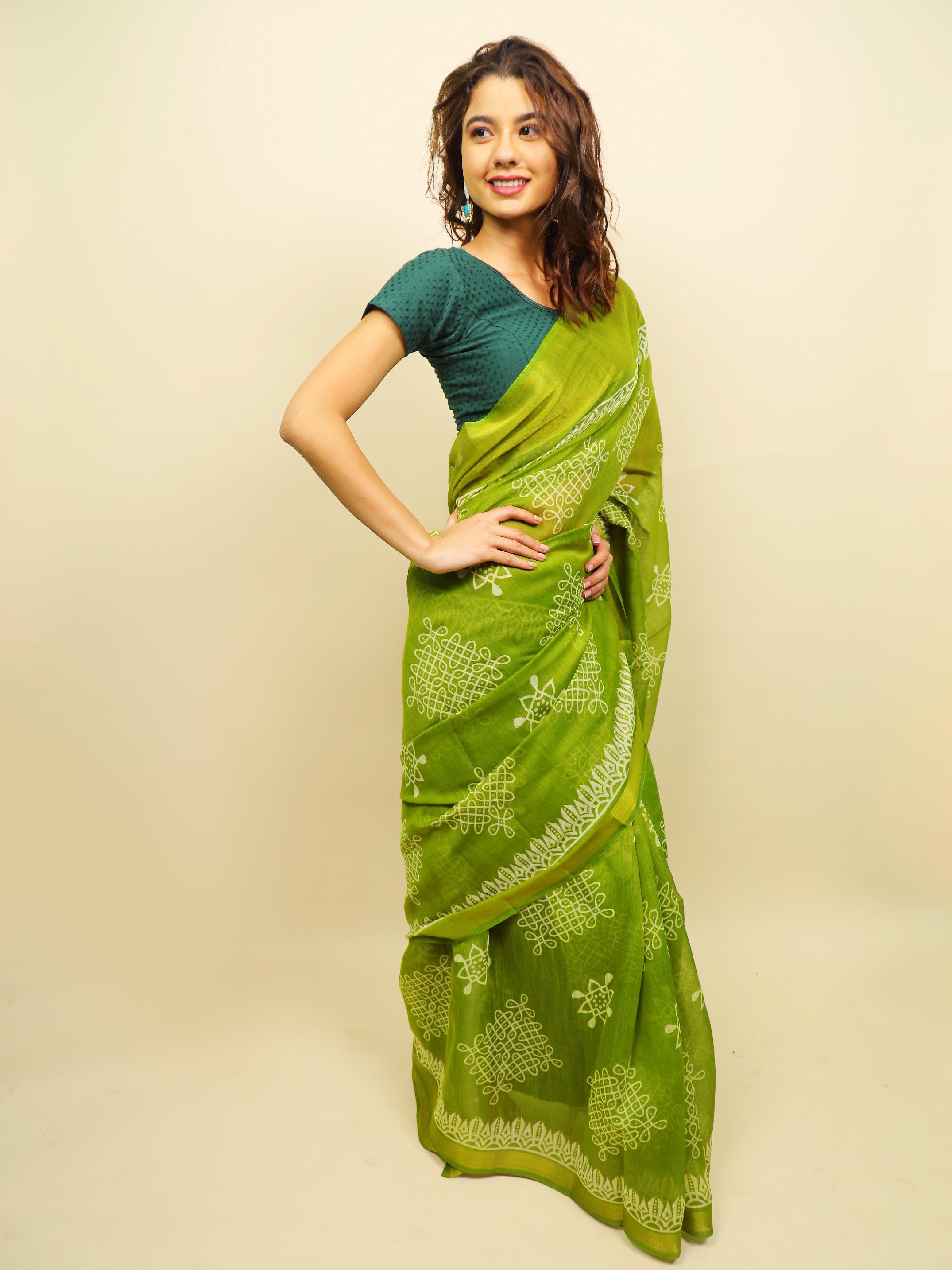 A "Soft Cotton Zari Border Printed Saree" is a versatile and comfortable choice that can be worn on various occasions. Here are some uses and matching suggestions: