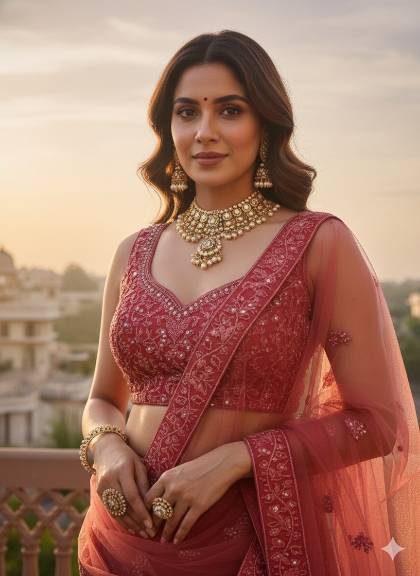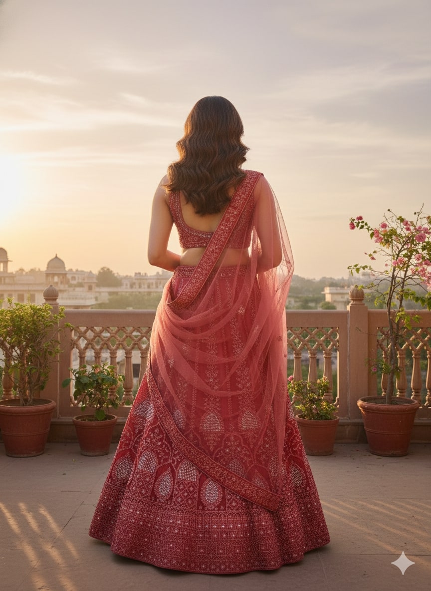 Make a striking statement with this brick red lehenga choli crafted in fine net fabric and adorned with intricate all-over embroidery. Paired with a sheer matching dupatta, this ensemble exudes regal elegance and festive sophistication.