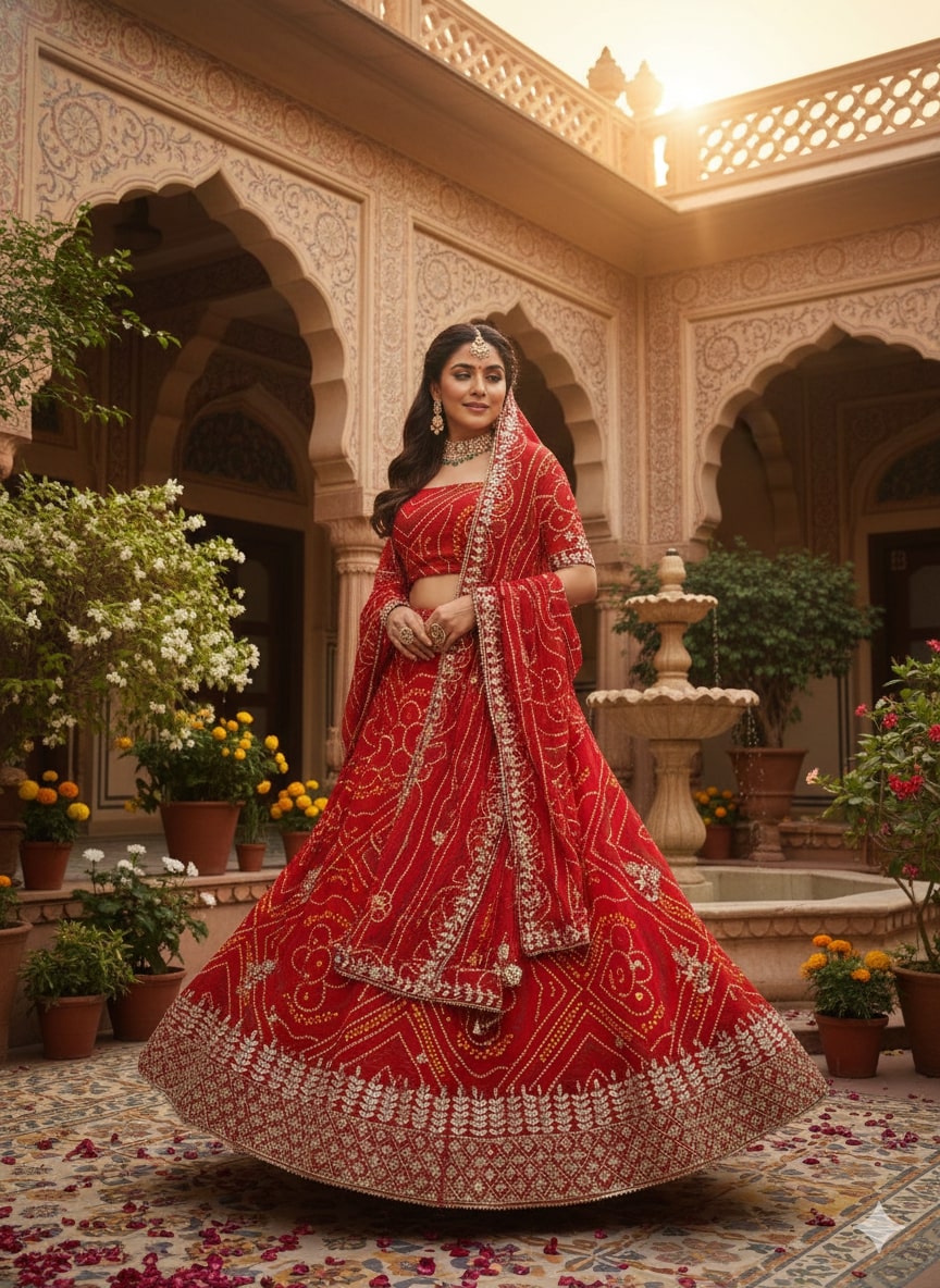 Product Description: Embrace heritage with this vibrant crimson red lehenga set featuring traditional Bandhani patterns. The lehenga is elevated with a heavy Gota Patti and Zardosi border, offering a rich, textured finish. Complemented by a matching red blouse and a dupatta with ornate borders, this set captures the essence of...