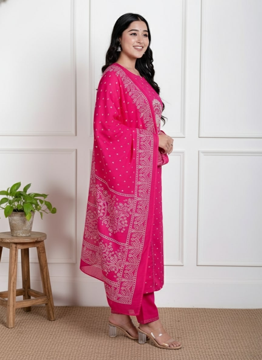 Make a bold statement with our Hot Pink Cotton Straight Suit Set. This eye-catching 100% cotton ensemble features a striking white mandala embroidery on the yoke that pops against the rich pink base. Designed for a modern yet traditional look, the straight-cut kurta is paired with matching trousers and a beautifully printed dupatta, making it a versatile addition to your ethnic wardrobe.