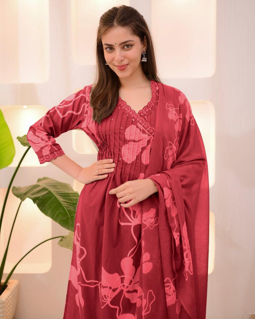 The design centers on an elegant pleated bodice that provides a structured yet feminine silhouette. The deep V-neckline and three-quarter sleeve cuffs are beautifully accented with intricate blush pink scalloped lace trim. Sweeping across the deep maroon base are large, artistic botanical floral prints in a contrasting pink, creating a bold and romantic aesthetic. Accompanied by coordinating straight-leg trousers and a full-length printed dupatta, this set is perfect for those who value artisanal craftsmanship and contemporary ethnic style.