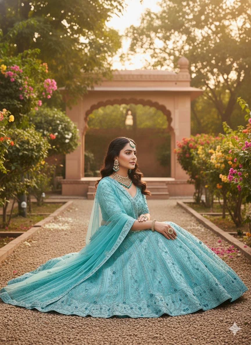 Product Description: Refresh your festive wardrobe with this mint green lehenga choli crafted in lightweight net fabric and adorned with delicate all-over embroidery. Paired with a sheer matching dupatta, this ensemble exudes effortless elegance and modern ethnic charm. Style Note: Featuring intricate floral motifs, fine detailing, and a beautifully flared...