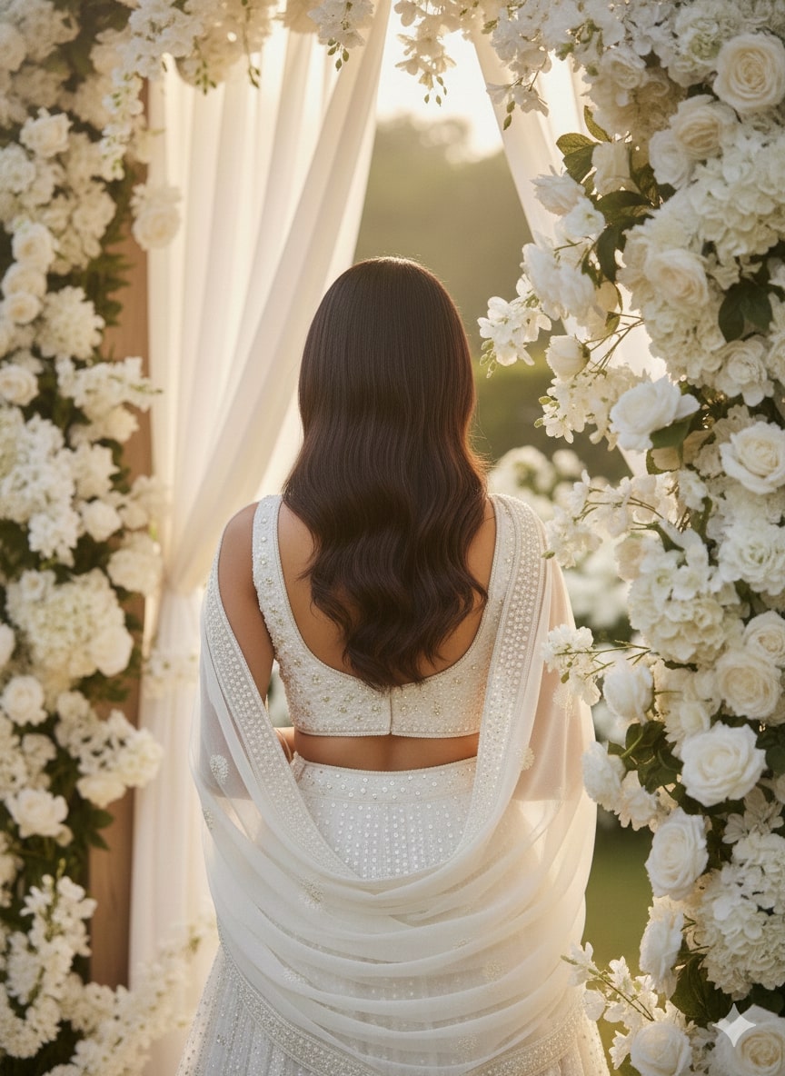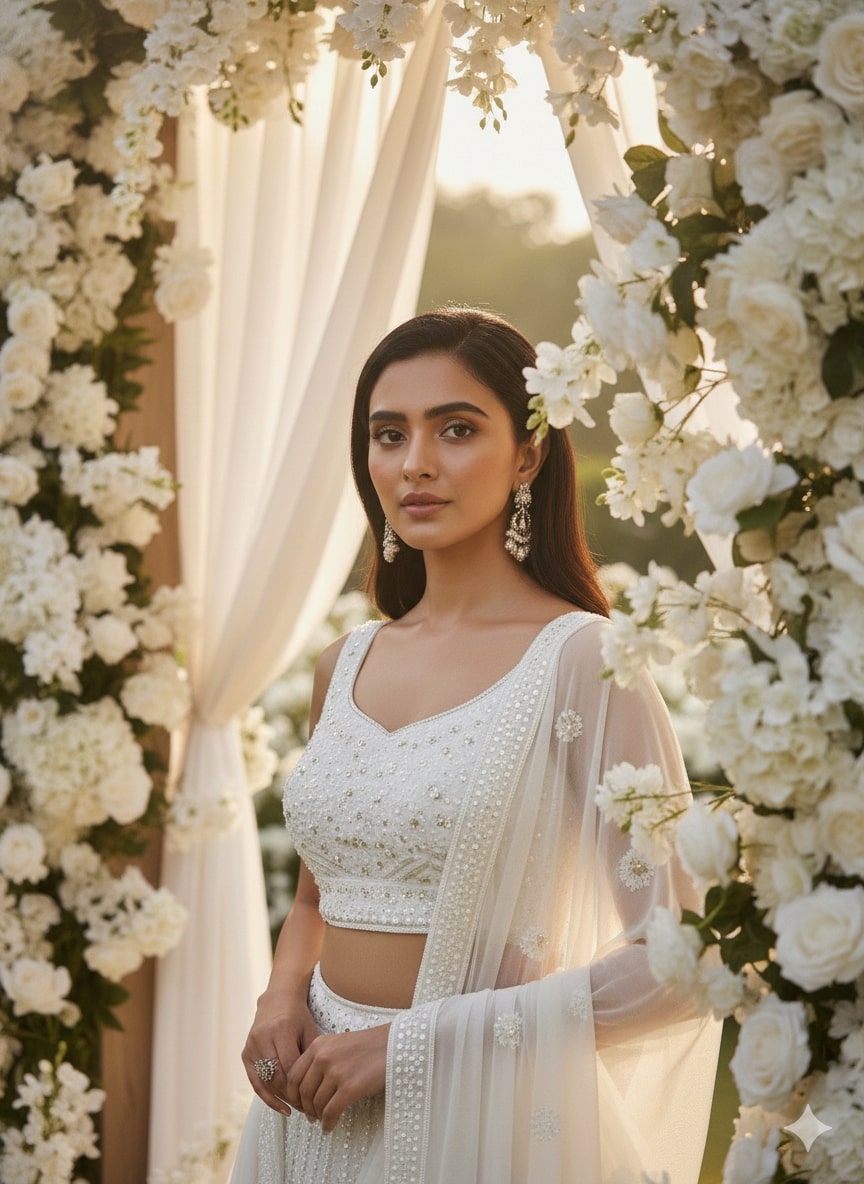 Style with pearl or diamond jewellery, soft nude makeup, and sleek straight hair or loose waves for a graceful, contemporary ethnic look.