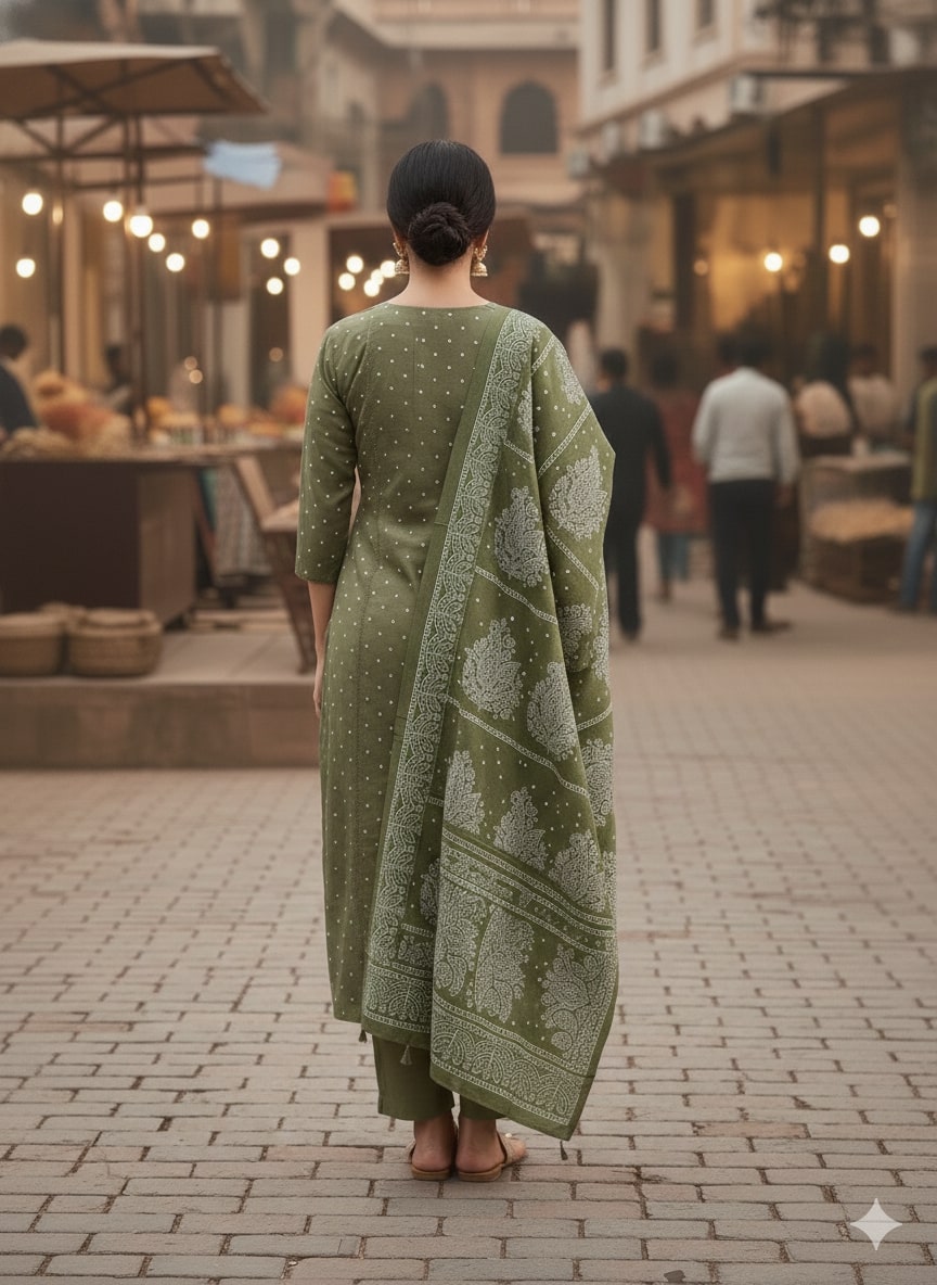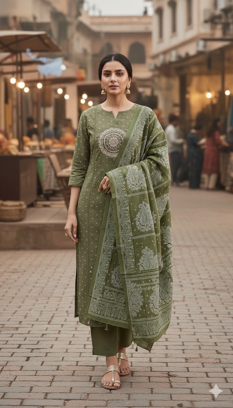 Step into understated elegance with our Olive Green Cotton Straight Suit Set. This sophisticated ensemble is crafted from 100% premium cotton, offering a soft touch and breathable fit perfect for daily wear or festive gatherings. The kurta features a beautifully detailed white mandala-style embroidery on the yoke and delicate micro-print accents across the body. Paired with sleek straight-cut trousers and a heavily printed matching dupatta, this set defines grace and comfort.