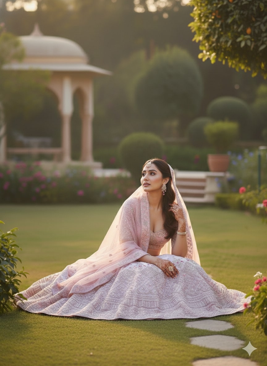 Featuring refined floral motifs, ornate borders, and a beautifully flared silhouette, this lehenga reflects timeless craftsmanship with a modern pastel charm.