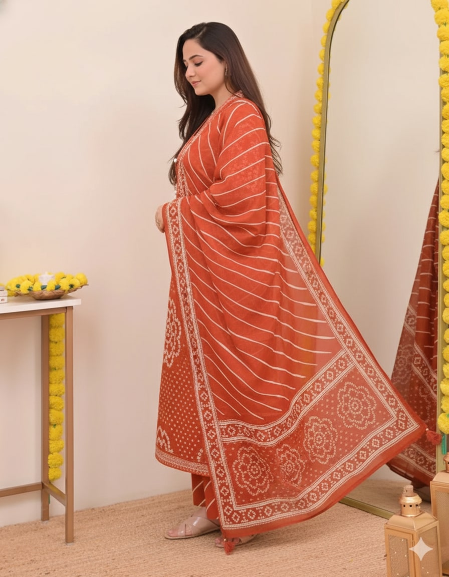 Rust Orange Pure Cotton Bandhani Suit Set – Intricate V-Neck Embroidery & Leheriya Print Dupatta