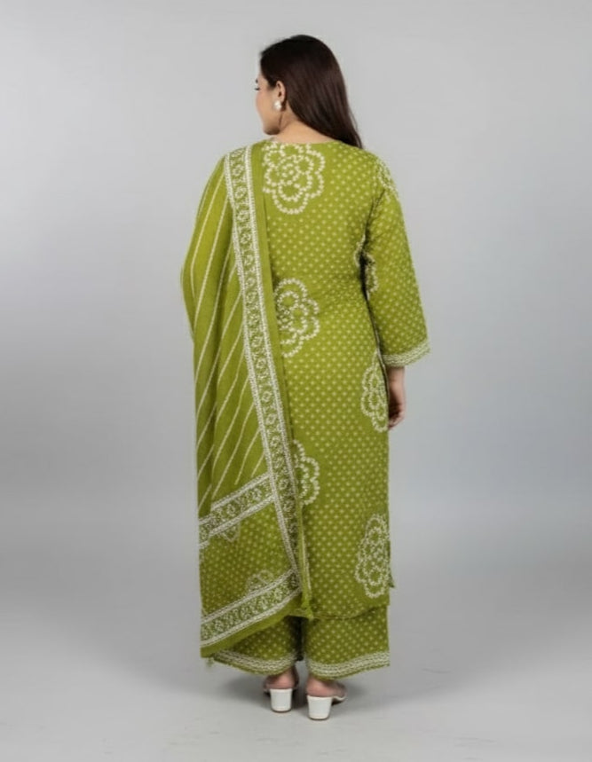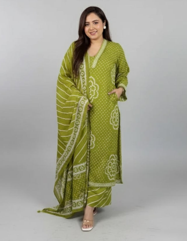 Sage Green Pure Cotton Bandhani Suit Set – Intricate V-Neck Embroidery & Leheriya Print Dupatta