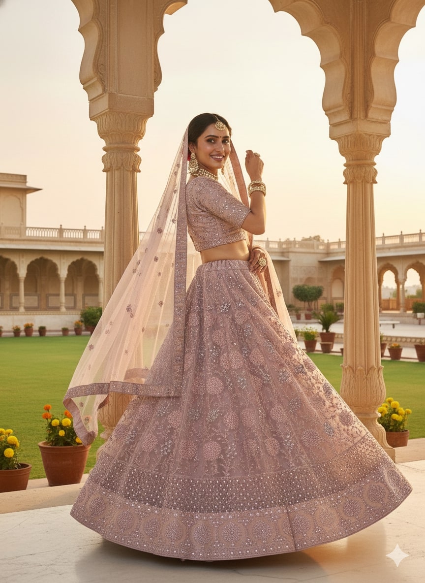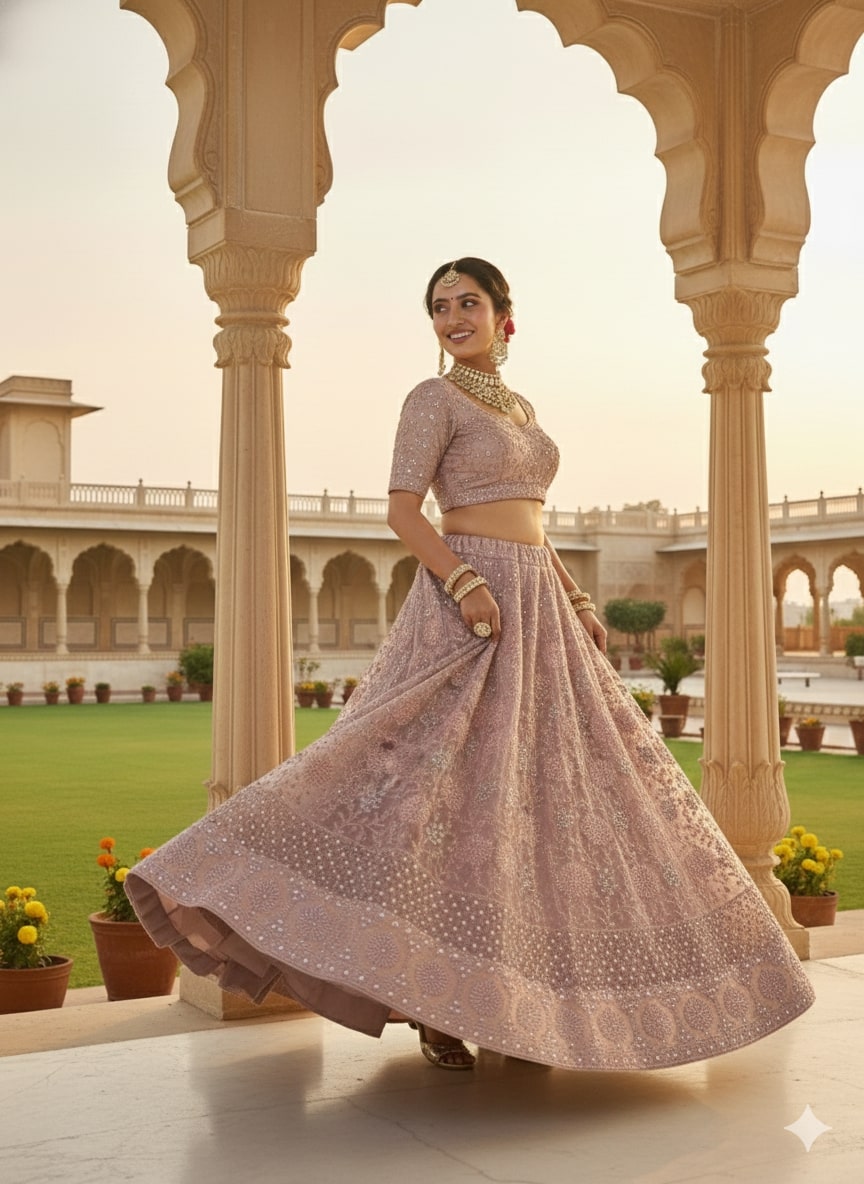 Featuring subtle shimmer detailing, ornate borders, and a graceful flared silhouette, this lehenga blends understated glamour with timeless sophistication.