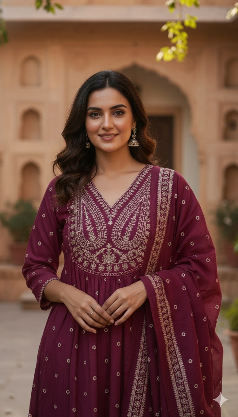 Wine Purple Cotton Anarkali Suit Set – V-Neck Leaf Embroidery & Polka Dot Print